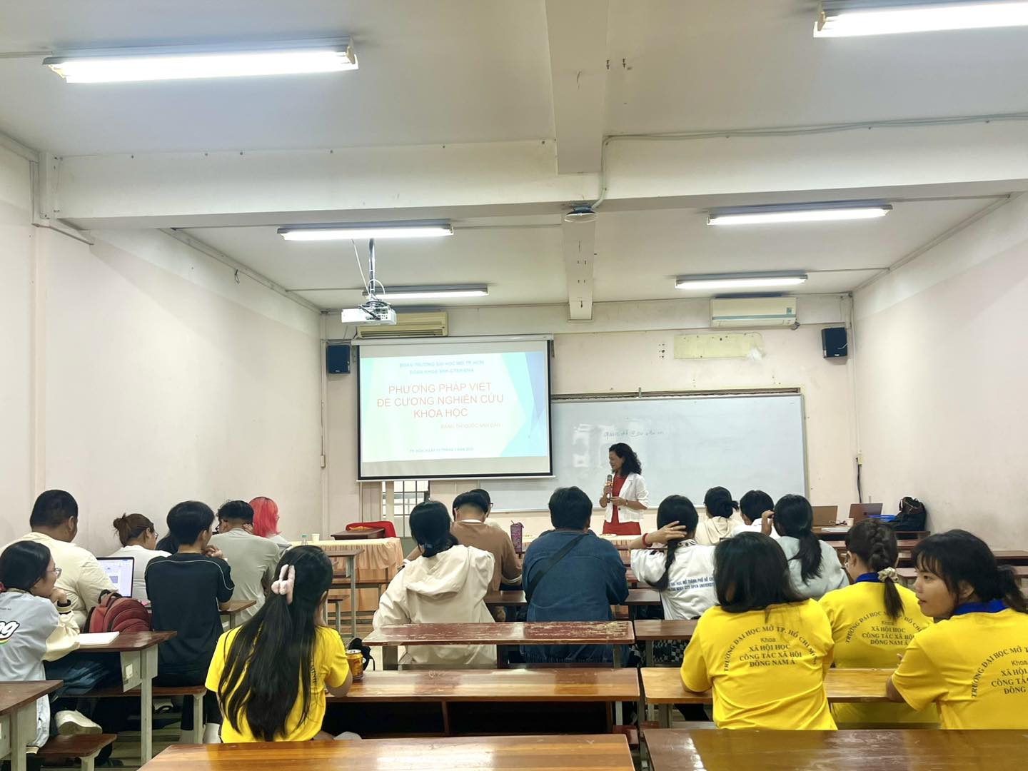 Các bạn sinh viên đã có cơ hội lắng nghe TS. Đỗ Hồng Quân – Phó Trưởng bộ môn Xã hội học và ThS. Đặng Thị Quốc Anh Đào – Giảng viên ngành Đông Nam Á trình bày về các phương pháp viết đề cương vô cùng thiết thực. Bên cạnh đó, chương trình vinh dự có sự tham gia của ThS. Nguyễn Thị Hòa – Phụ trách nghiên cứu khoa học và hoạt động sinh viên ngành Công tác xã hội, cùng với ThS. Nguyễn Thị Thanh Hà – Giảng viên ngành Công tác xã hội, đã đồng hành, hỗ trợ và truyền đạt thêm những kiến thức bổ ích giúp sinh viên hiểu rõ hơn về quy trình và cách tiếp cận khi xây dựng đề cương nghiên cứu.